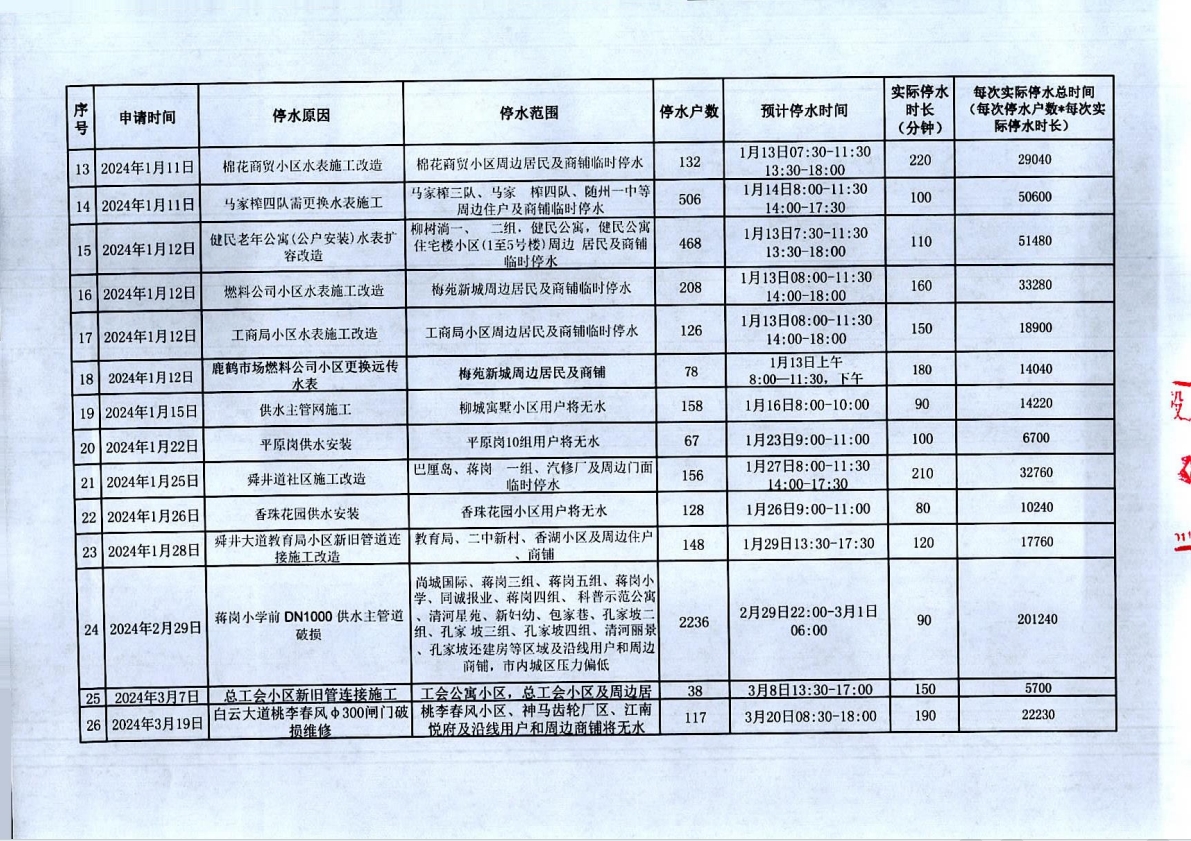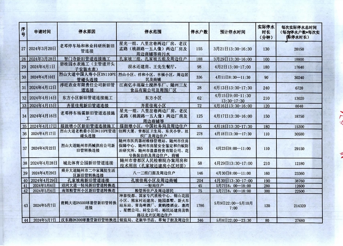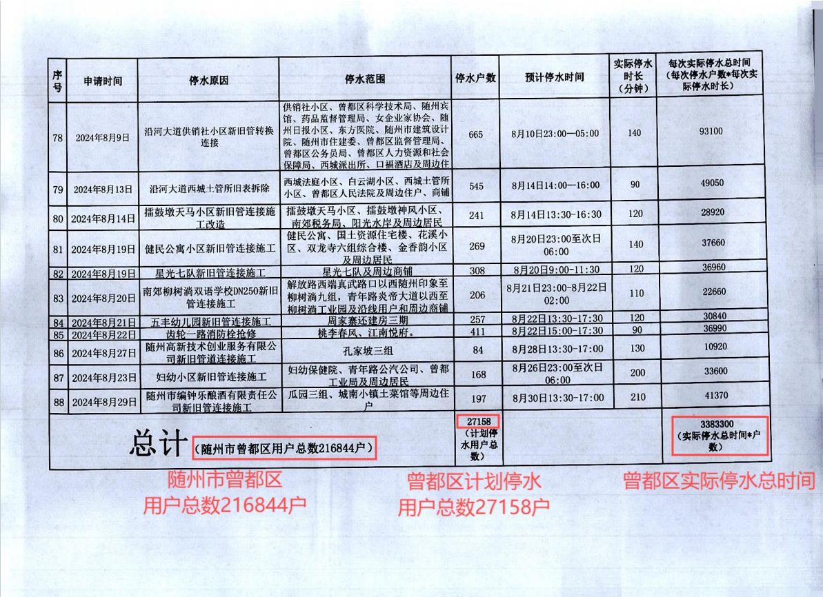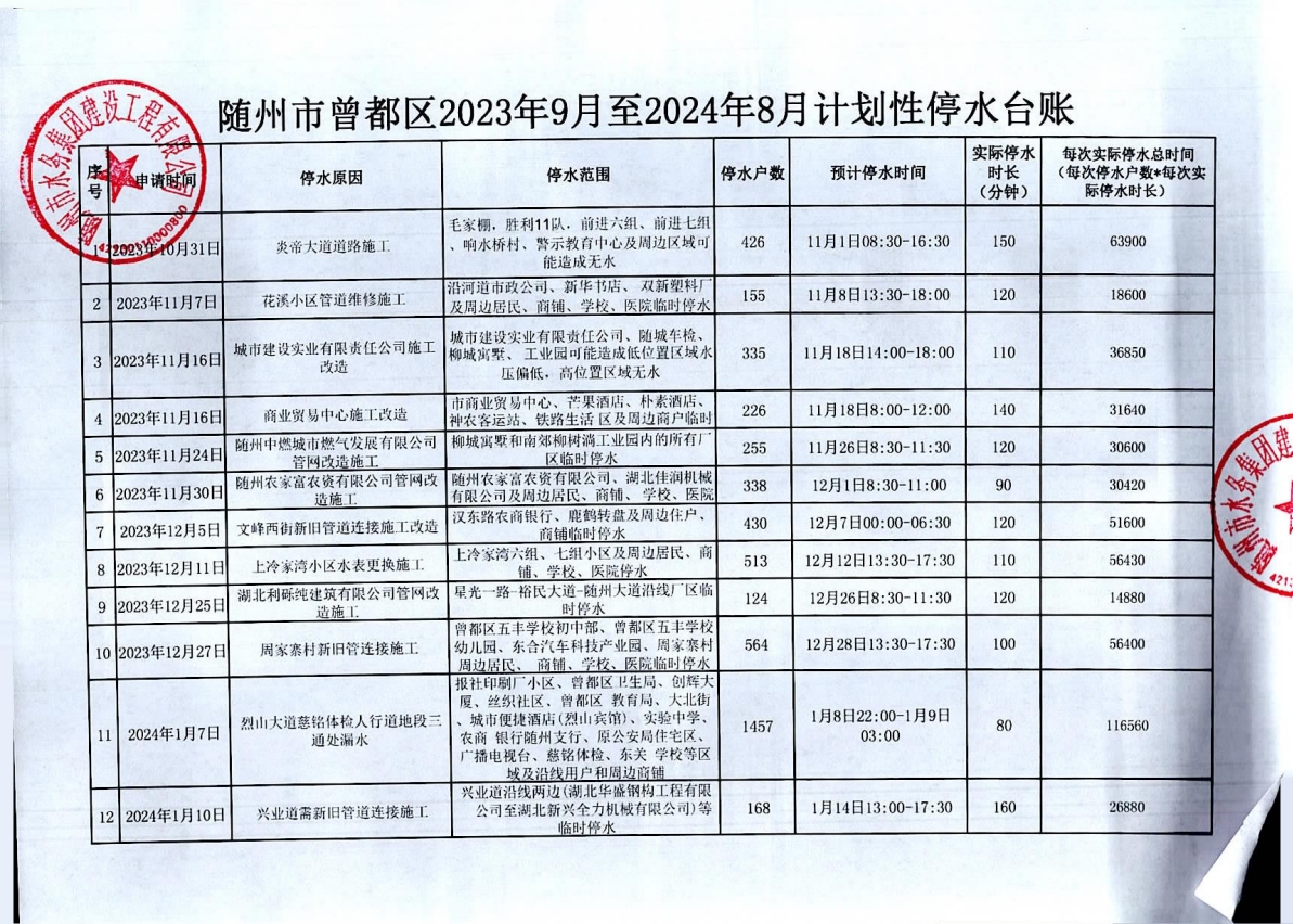 隨州市曾都區(qū)2023年9月至2024年8月計劃性停水資料